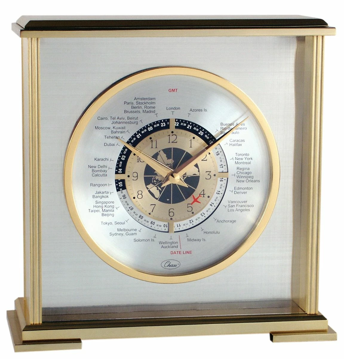 Pretty Cool. Need a gift for someone that travels a lot, is a pilot or talks to different countries frequently – this is the perfect clock for them. The 2nd hand is a red airplane – see it? Twenty five time zones are shown on the clock. Very special. the exterior is made of metal with gold or silver tones. Quite elegant.