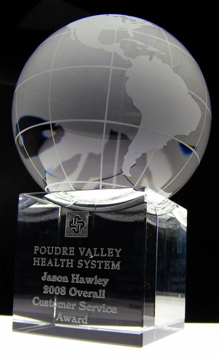 This clear crystal optical glass globe can spin freely on its base. It has a 3 1/8″ diameter. FREE text – up to 30 characters – can be etched on the base. Imprint area measures 1-15/16 x 1-15/16 inch.