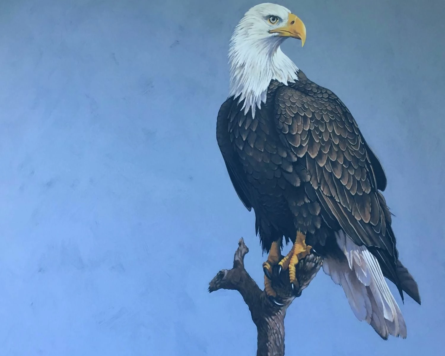 The photo shows a bald eagle in Florida. The eagle is perched in a tree. You can see the comparison of the white and dark feathers. The huge yelllow beak, the yellow talons that are so strong. The eyes that see so much better than a human’s eye. Photo shows it all.