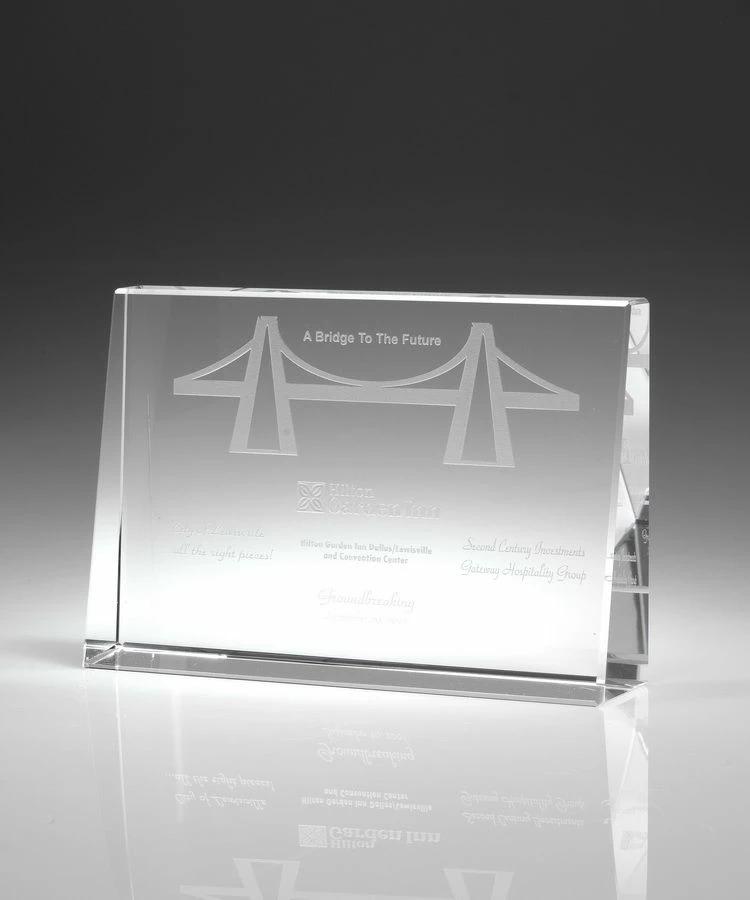The Baldwin award is available vertical and horizontal. This Baldwin Award is the horizontal one. Made of crystal and customization is available. Area available for personalization is: 4-1/2″ x 3″ (5″), 5-1/2″ x 3-1/2″ (6″), 6-1/2″ x 4-1/2″ (7″)