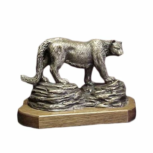 Cougar Statue is made of bronze in the USA. Notice its eyes. Very focused. The cougar appears to be walking on rocks while on alert.