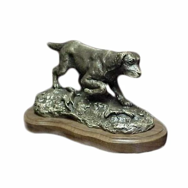 This bronze labrador statue has a pewter finish. You can see the tail is extended as it focuses on something in front of it. Lots of muscular and bone structure.
