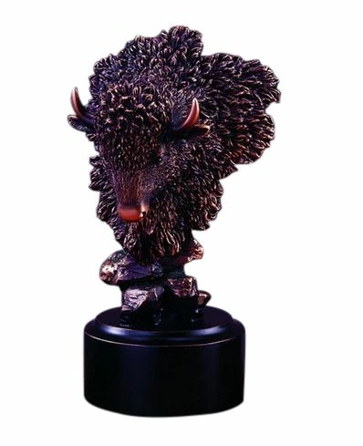 This relatively small Buffalo head stands 7-1/2 inches H. The “fur” of the buffalo is realistic. The core of the buffalo head is resin which has been electroplated with bronze for a lasting finish. It is possible to put a short plaque on the base. Base has 3 inch diameter and is 1-1/2 inches H.