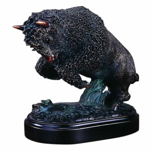 This buffalo statue looks like one to avoid! With it’s head lowered and it’s front legs raised it has a very aggressive stance. The statue combines the shaggy front and smoother rear quite well. Made with a resin core and then electroplated with bronze.