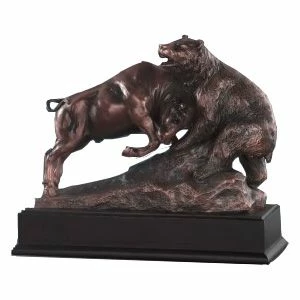 This bronze bull and bear sculpture has been electroplated to provide a lasting finish. The core of this sculpture is made of resin which allows the wonderful “fur” on the bear, the muscles of the bull, even the gaping mouth of the bear.