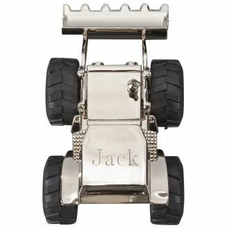 Personalization text will be engraved on the top of the cab (the roof) although other locations are possible. Be specific if you want to personalize a location. Made of metal and electroplated with nickel so the bank will not tarnish. Ships in gift box.