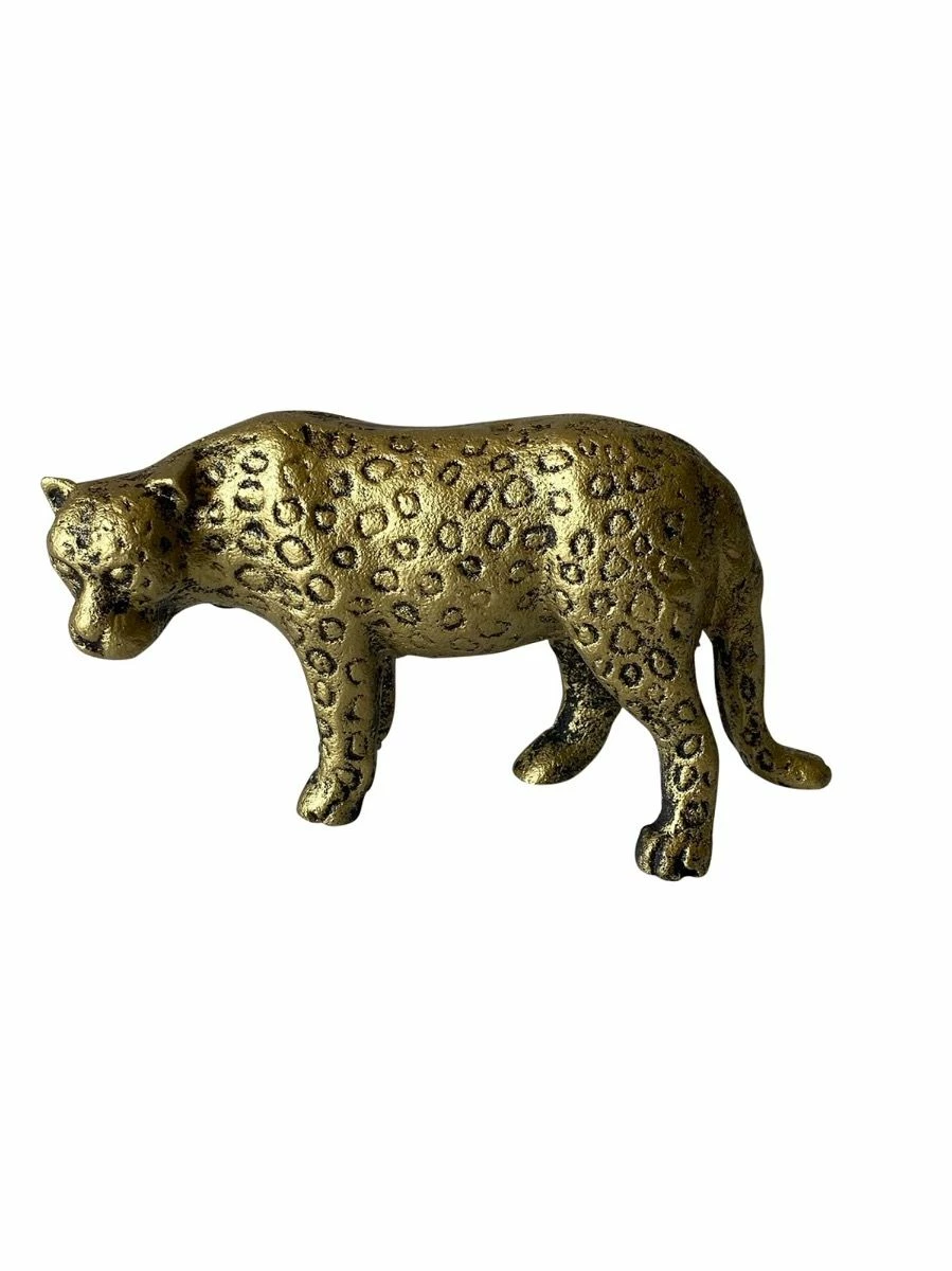 Looks delicate, doesn’t it? Yet, this cheetah is made from cast iron. That means it strong, just like a cheetah. The spots are well done. A gold color finish.