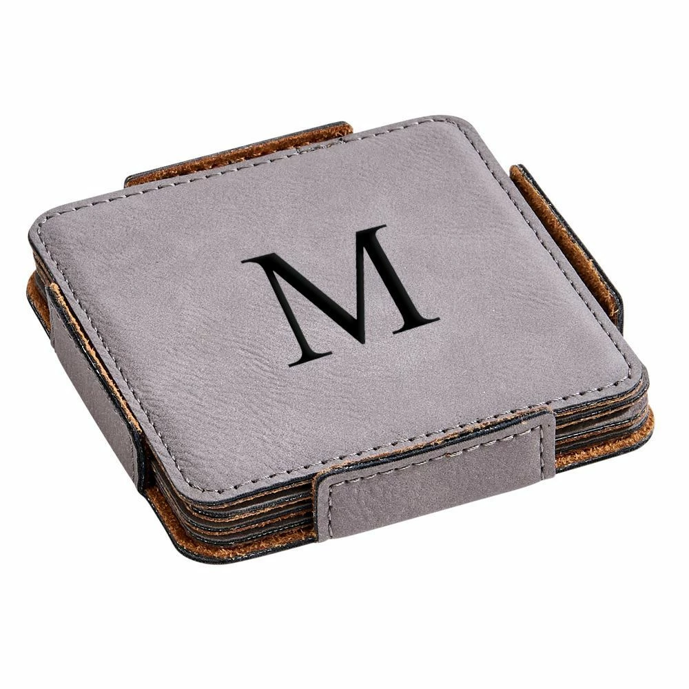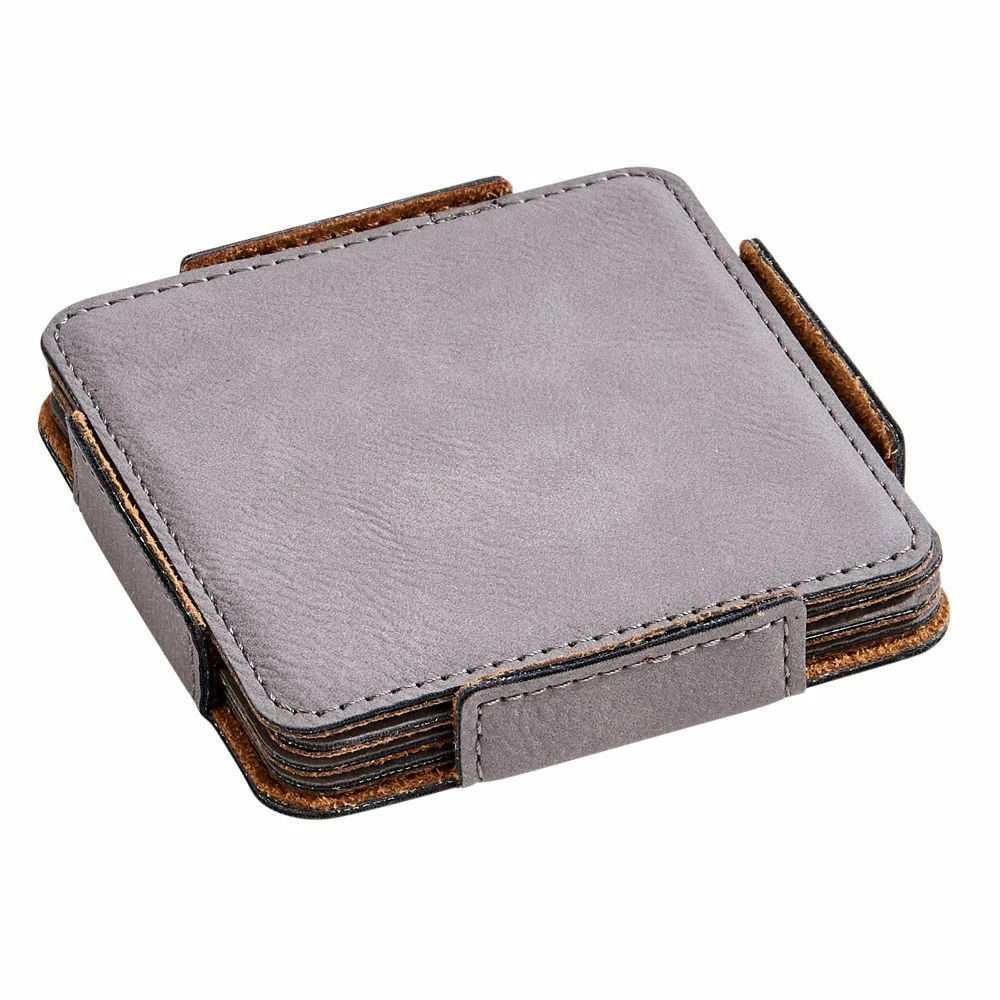 Protect surfaces by using the grey colored leatherette coasters. Each coaster meaures 3.75″ x 3.75″ and they sit in a grey colored leatherette holder. Personalization is possible with laser engraving which will show as black. Gift boxed.