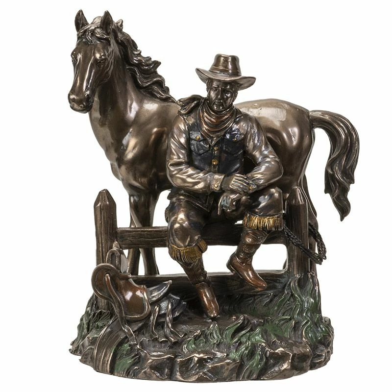 Even a Cowboy needs to rest! This resin statue depicts a Cowboy sitting on the rail of a fence with his saddle on the ground near his feet. His horse stands patiently on the other side of the fence. The thoughtfulness of the cowboy removing the saddle from his horse is shown. Even his horse can rest.