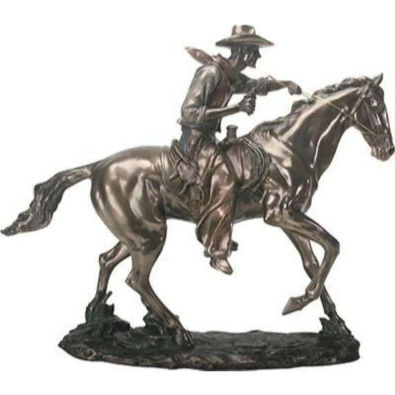 The cowboy is wearing a cowboy hat and has a kerchief at his neck. He’s wearing chaps and cowboy boots. The statue is made of resin and has been hand painted a dark silvery color. The horse has good action happening. It’s front hoof is raised and it’s head looks very focused as it moves forward.