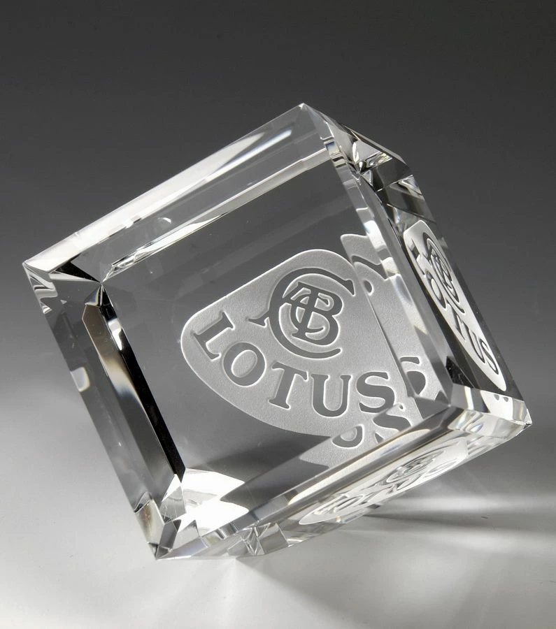 Sits on an edge! This Crystal Cube Award is made of optical crystal and makes you want to pick it up. Pretty awesome.