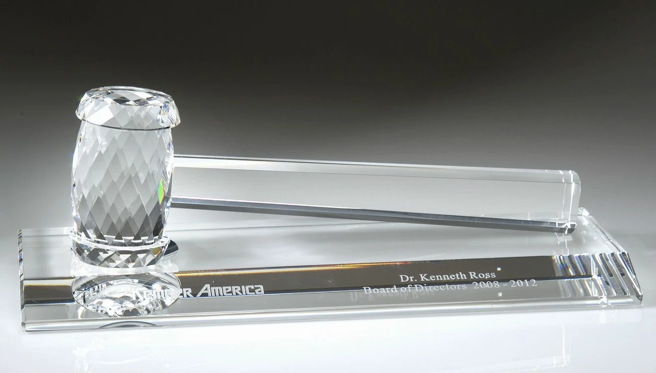 This is a good-looking crystal gavel. It’s what you should own when you have the final say in the office. Lay down the law with its smooth handle and beautifully designed block–the top of the gavel. It is available for personalization to fit your wants. You can laser-inscrbe customize the handle, the base, or wherever you like!