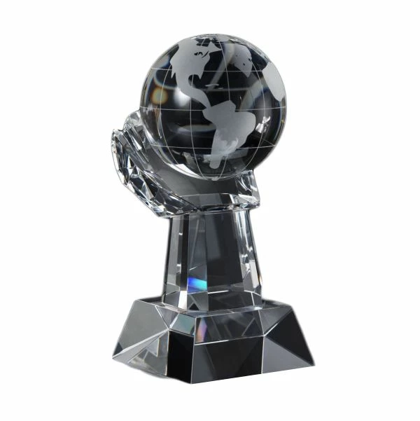 Crystal Globe is held by a crystal hand – all handcrafted in the USA. As an international business or businessman…want the world in your hands?