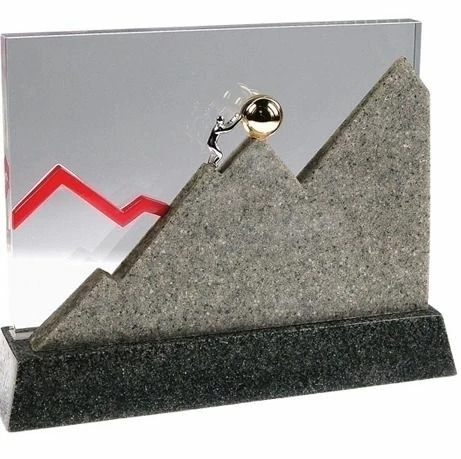 Many times it may feel as if you need to push a ball uphill. The difficult road to success is visible. In the middle of the “mountain” you see a silver figurine pushing a golden steel ball up hill. The clear crystal wall is set into a ceramic & granite base. A plaque can be adhered to the base. The imprint area is on the base. ( 6″ x 1″).