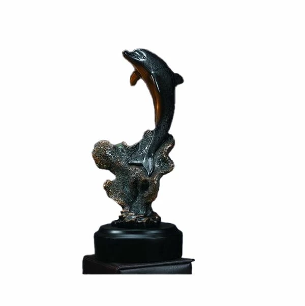 Dolphin is leaping high on this 10″ H statue. the dolphin is primarily a dark steel color with a little bit of copper on its underside. The whale is made of resin, then electroplated for this lasting finish.