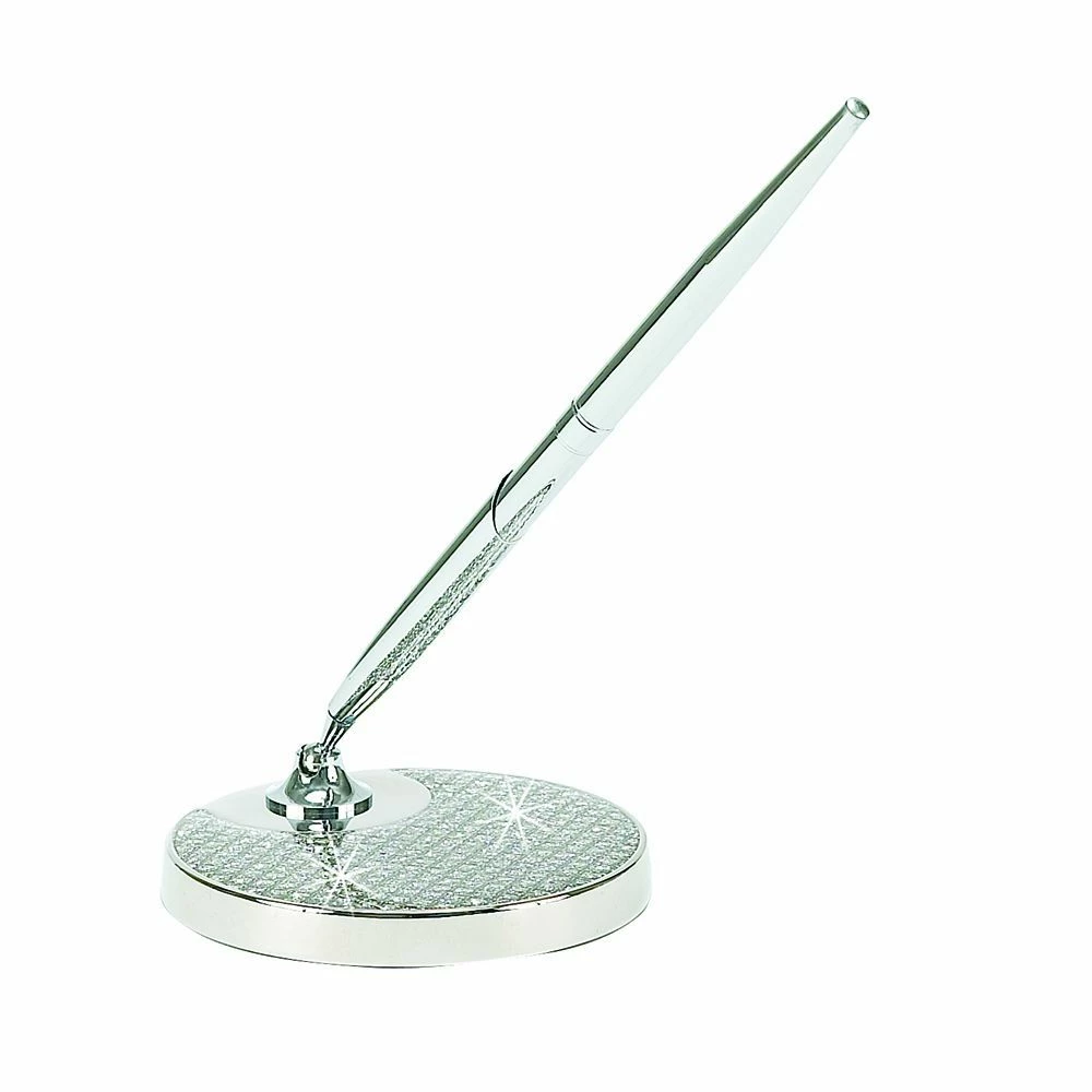 Crystal cover the base of this acrylic pen holder giving it a glitter look. A fun pen set that takes up little room with its 3 inch diameter base. The pen is 6″ long and is a non-tarnishing, silver-colored metal. Refills for the pen are readily available. White gift box. No personalization.