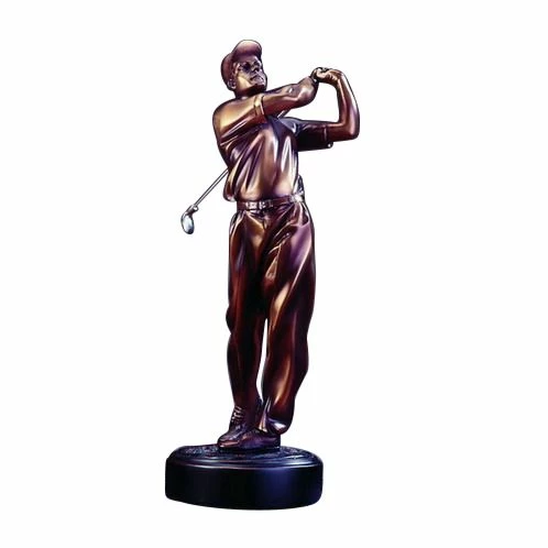 This bronze golfer has a resin core. You see the wrinkles in the slacks and shirt as the golfer completes his swing.