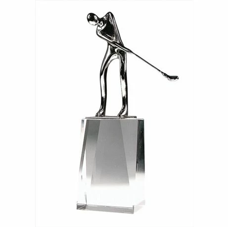 Golfer has a shiny silver finish and stands on tall crystal base. Overall this golf award measures 10 inches high. The golfer has just taken a swing. How do you like the swing? Good?