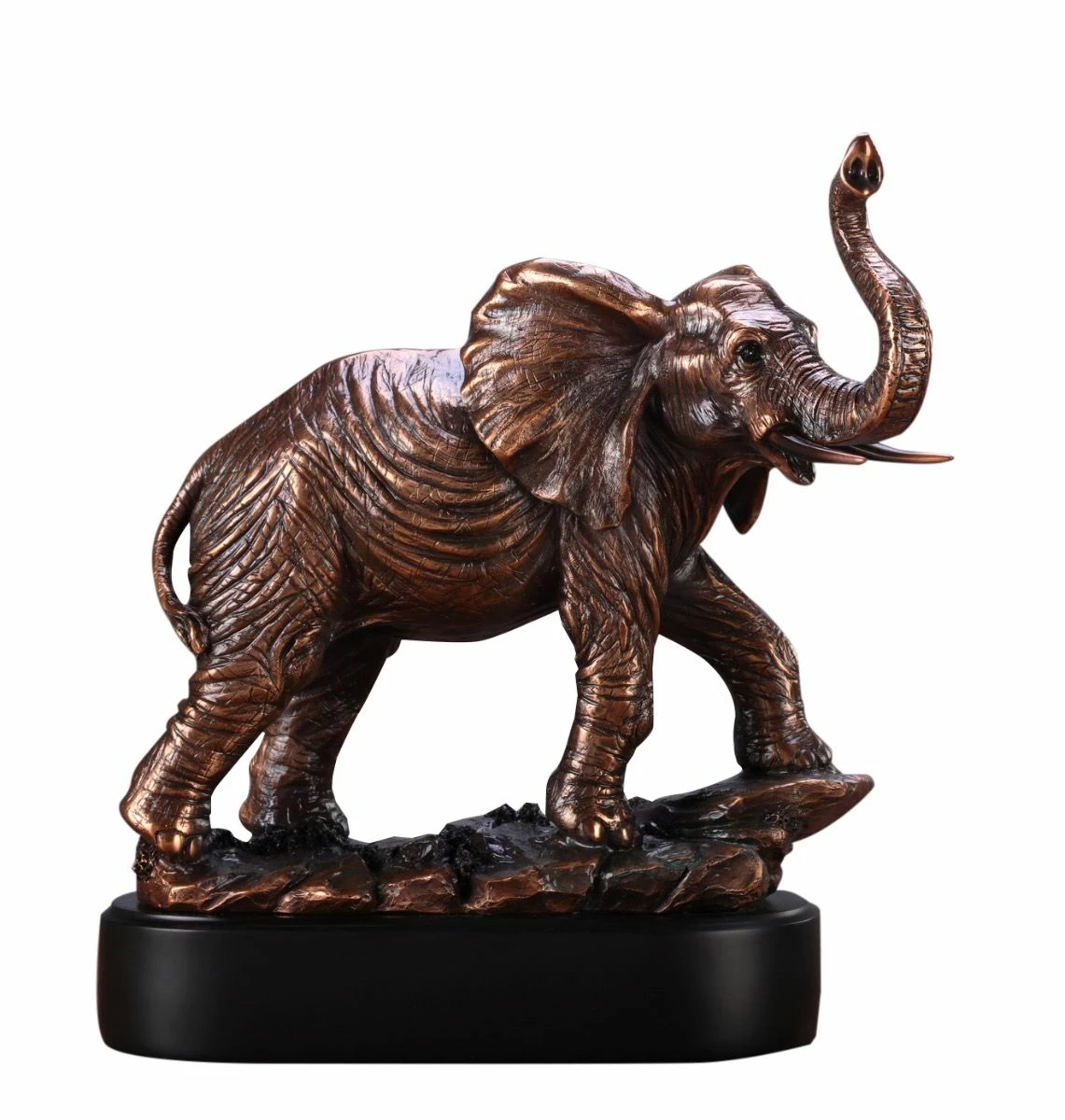 The core of the elephant is made of resin. It is then electroplated in bronze for a lasting finish. By using resin, the sculptor is able to show lots of wrinkles and flared ears. Personalization is possible with a plaque. The wooden base can have a plate 6 inches long and have at least 6 lines of text. Base is 2 inches high.