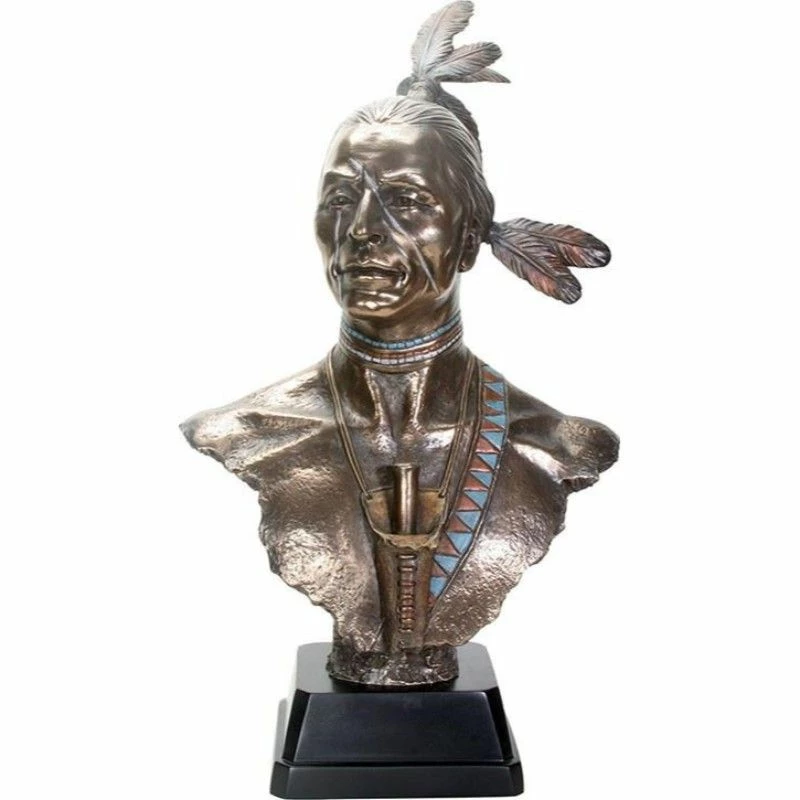 This Indian bust is made of resin and has a cold-cast bronze finish. The chiseled face is possible due to the method of creating this statue.