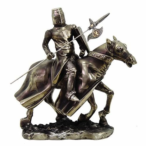 This knight statue is made of resin and been hand painted. Wonder what the horse thought about the armor illustrated on this statue? The “skirt” was quite long. The horse’s head is covered. And, then there is the knight! Note the shield he has on his left arm. Keep looking…there’s so much to see…