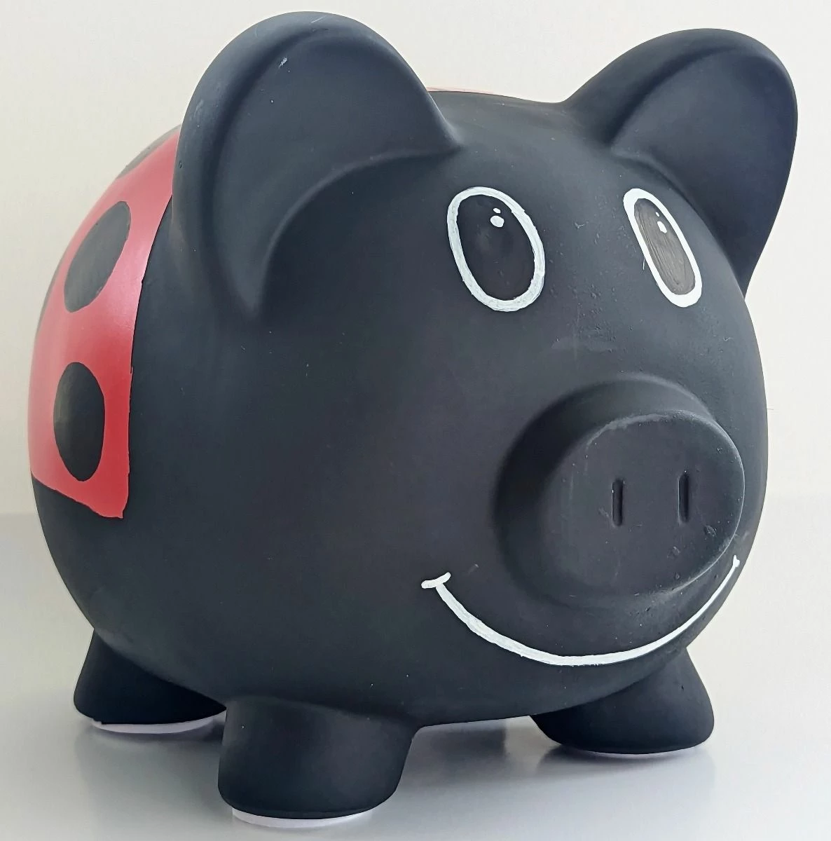 This ceramic piggy bank has been transformed into a lady bug. An adorable lady bug with huge eyes.