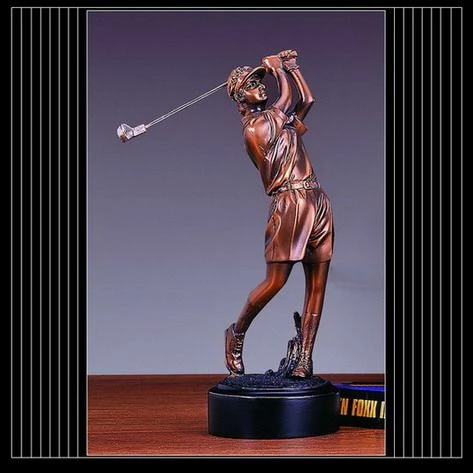 Lady Golfer stands on base. She is 9 inches high and the base can be personalized with a plaque.