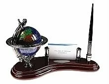 The pen set features a Lapis Gemstone globe with an etched map. The latitude and longitude indicators are visible and the globe is held together by a black-nickel decor ring.