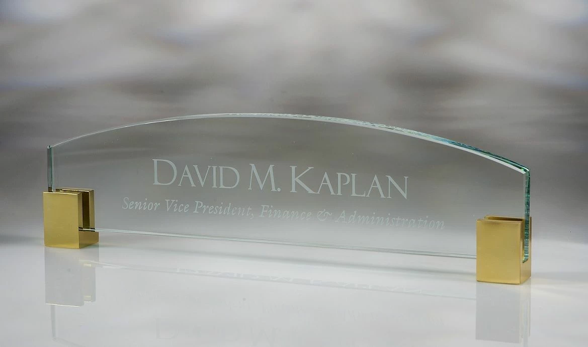 The corners can coordinate with your office – chrome or brass. Name plate is made of jade glass and ships in a deluxe box.
