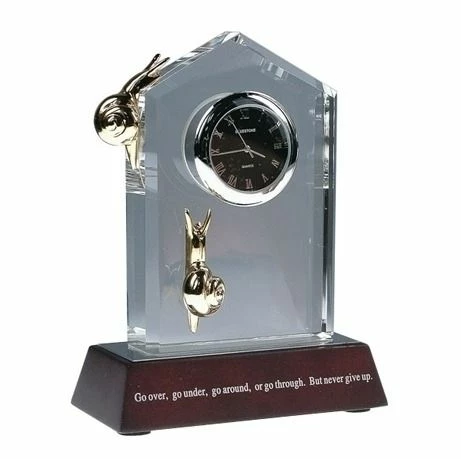 The crystal tablet has a clock encased in it. The clock’s face plate is black with silver accented hour/minute hands. There is a gold finished metal snail crawling on the upper left-hand side of the crystal tablet and another is climbing up the front of the crystal towards the clock.