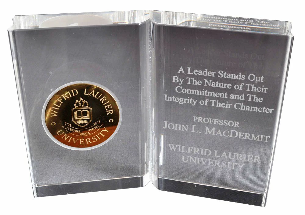 This clear crystal award resembles an open book. Due to the angle of the pages, the award can stand upright without having a base.