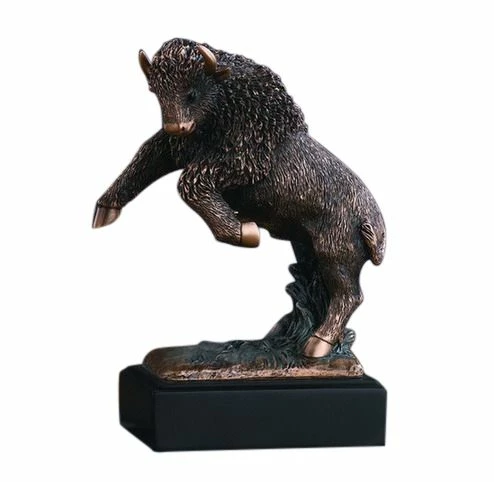 This Buffalo statue has an unusual pose. One doesn’t think of a buffalo pawing the air. But, that’s exactly what is happening with this statue. The shaggy front of the buffalo and the smoother rear end are well depicted. the core of the buffalo is resin which has been electroplated with bronze for a lifetime finish.