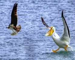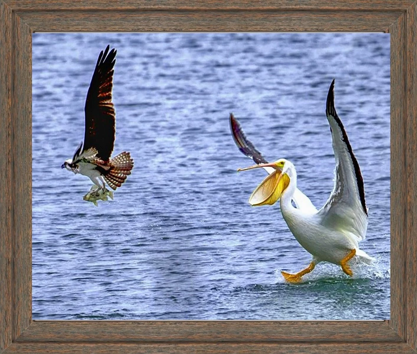 You see a pelican with bill wide open quite mad…why? Look at the Osprey flying away…check out the fish the osprey has in its talons. You guessed it! The fish had been in the bill of the pelican..but, no more! How fun! How many people in the world have seen this happen…we know one person who saw captured the moment in this photo.
