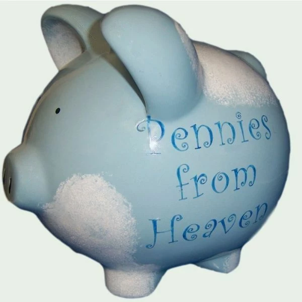 When my Dad died, a friend gave me the poem, “Pennies from Heaven.” I began to pick up every penny I saw lying on the ground. I find it amazing that when I’m most troubled or the most indecisive I always seem to find a penny. One day I got out of my car at the warehouse – with a major problem I had to address. I couldn’t decide what to do. Twenty minutes later I went to get back in my car. There right next to the door were two pennies which were not there when I parked. My Dad was with me. I made the decision with what I perceived to be his help. I doubt if I’ll ever throw one of “Dad’s pennies” away; but I needed a place to keep them. So, this piggy bank was designed for me. I hope it will be as meaningful to you as it is for me.
