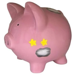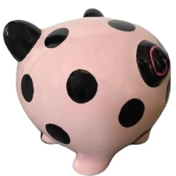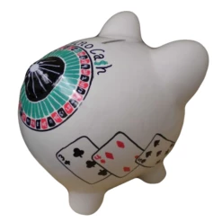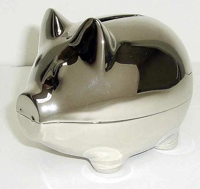 This piggy bank is a classic shape, but instead of being made of the easily smashed ceramic material, it is made out of a shiny metal. The industry used to use silverplate for banks like this; however, that has changed and now these banks have a nickel finish. The advantage of the nickel finish is that it does’t tarnish like the silverplate did. It is a very strong material, and if taken care of properly, this classic shiny piggy bank can last for years and years.