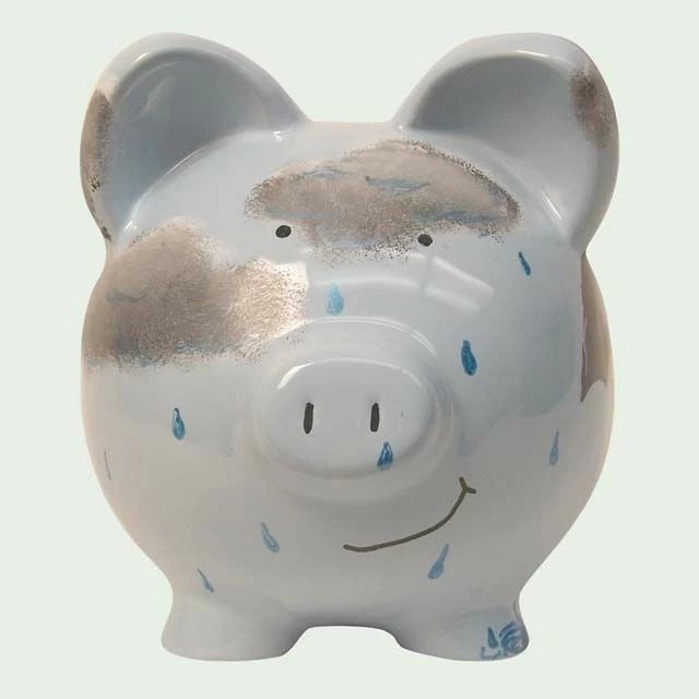Be Prepared is a necessity for all of us – no matter our age. We all encounter storm clouds. You’ll note there are storm clouds on this pig. Love the face and the half smile under the storm clouds. Pig has plug on bottom of belly.
