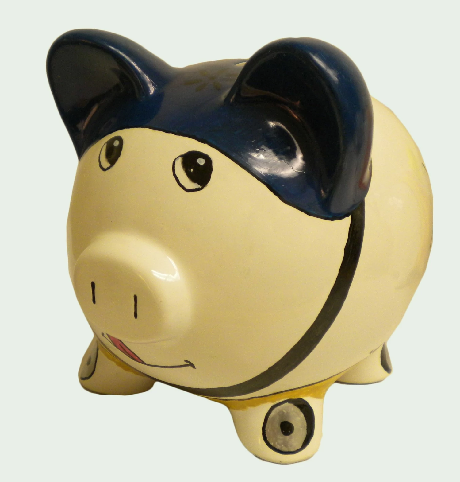 This great skateboarding piggy bank comes ready to have fun with a big smile on his face, a blue helmet, a skateboard with a wheel on each foot and skateboarder on the back riding a rail. As the mother of two boys, our artist knows lots about skateboarding. Skateboarding is fun and also a form of transportation. I’ve seen surfers on the way to the beach on a skateboard, carrying their surfboard!