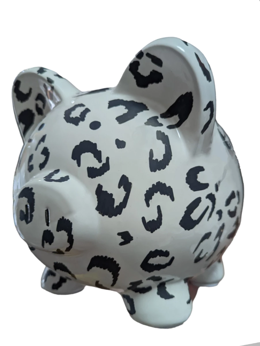 Our artist began with a white classic ceramic piggy bank. Then leopard spots were added. Made of ceramic. Piggy bank has a removable rubber stopper in the bottom of its belly to retrieve your savings.