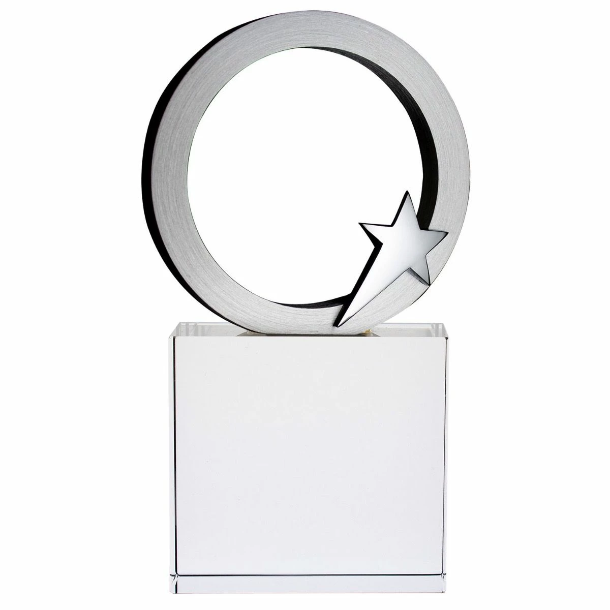 Looks like an orbiting star with a large base that has lots of room for personalization. The circle and star are made from brushed aluminum. The base is made of crystal glass.