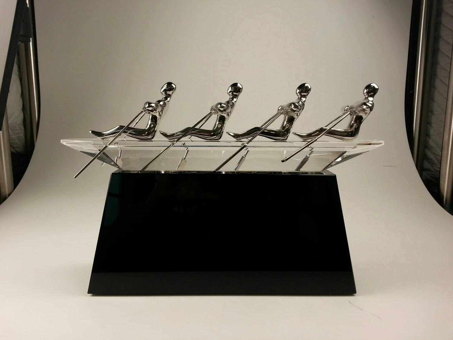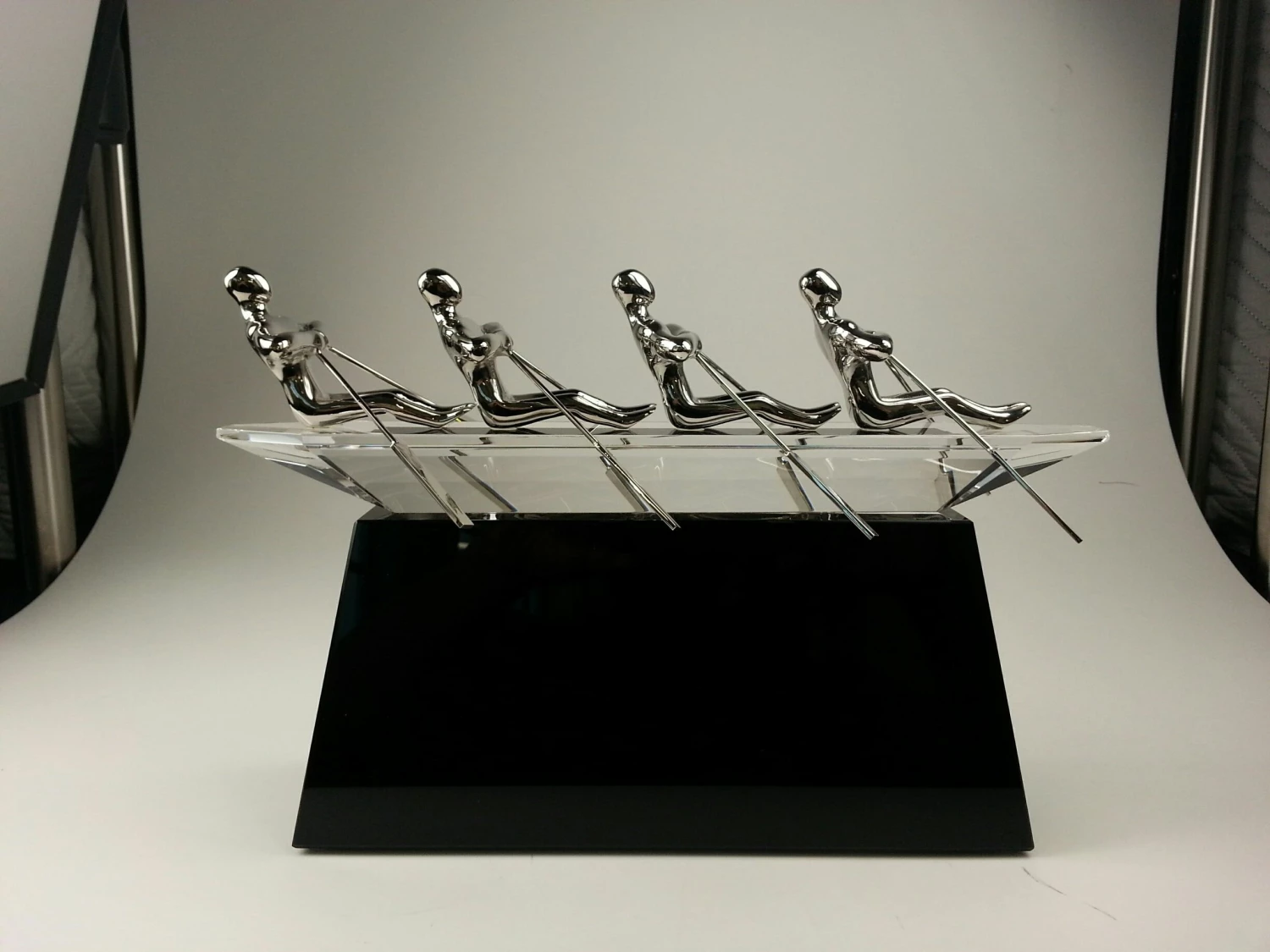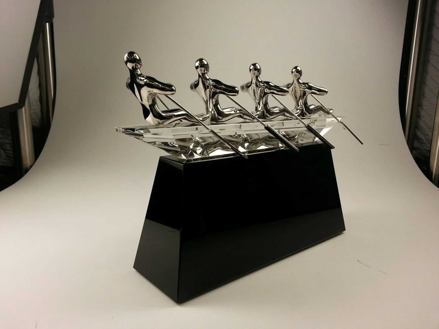 The boat is make of black crystal. The four rowers are made of silver (nickel) alloy. Quite elegant.