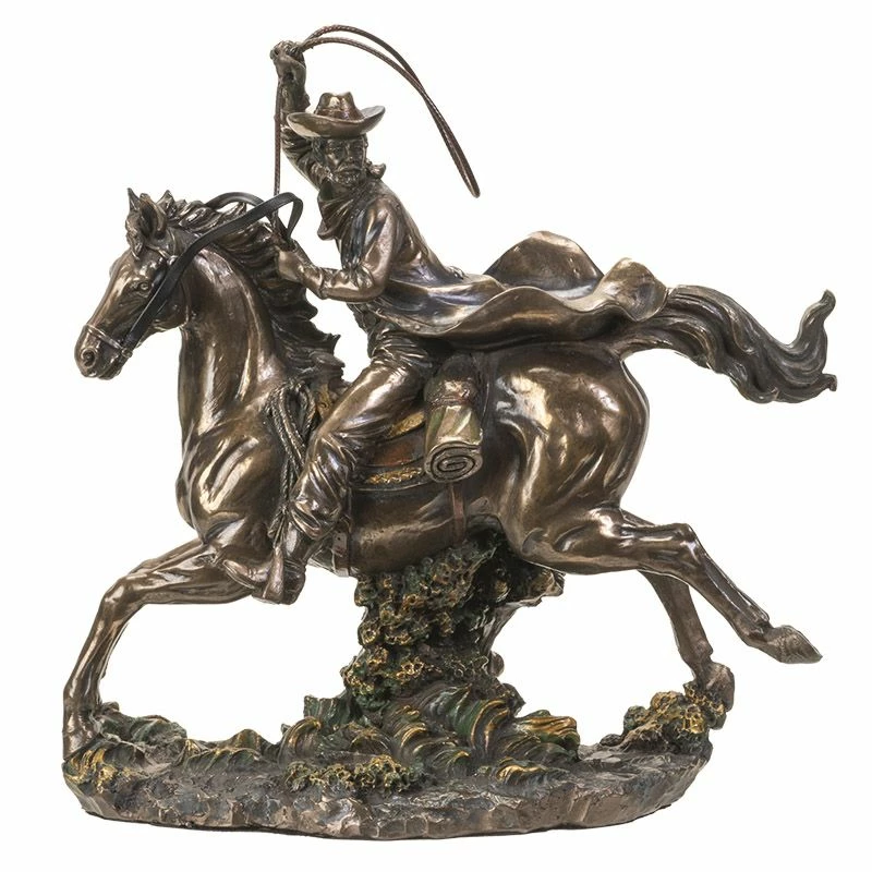 This Cowboy statue is made of resin which allows a lot of detail. The horse’s tail is flying, a bed roll is tucked behind the cowboy’s saddle. The cowboy’s face is intense as he has his lasso overhead to get the stray animal.