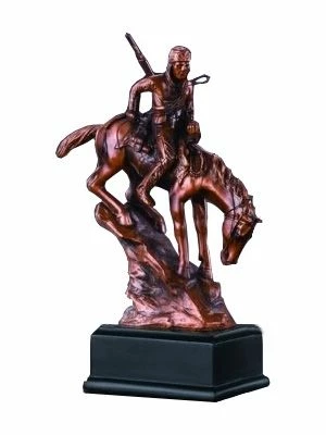 A beautiful tribute to the Native American rider and horse. You can personalize the black base with a plaque. We would recommend a black plaque with gold letters. Electroplated with bronze on a resin core. Base measures 3 x 2 x 1 inch. Only a small plaque will work.
