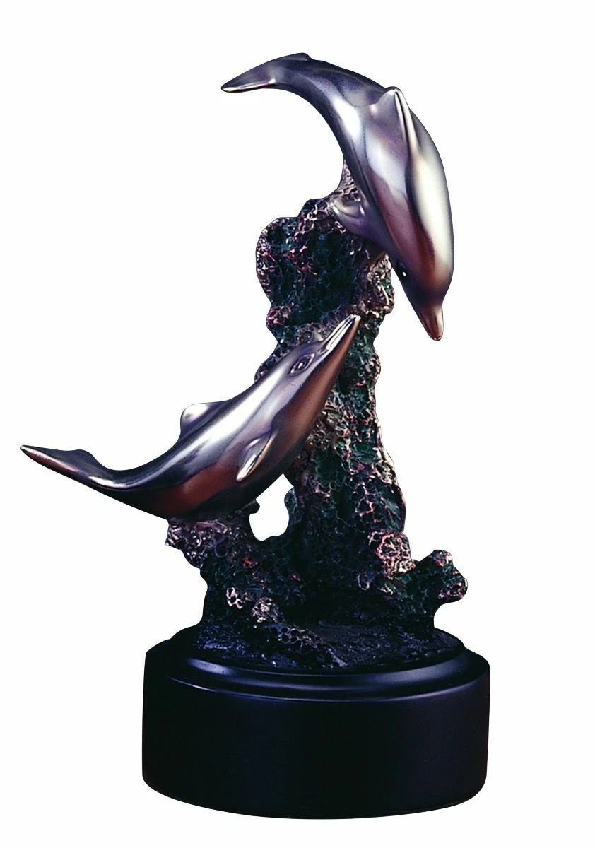 Two Dolphins playing among the rocks is one of our smaller dolphin statues measuring just 7 inches high.The top dolphin appears to be diving down as its tail is fully extended. A dolphins tail is what it uses to move. The lower dolphin has twisted it’s body around a rock.