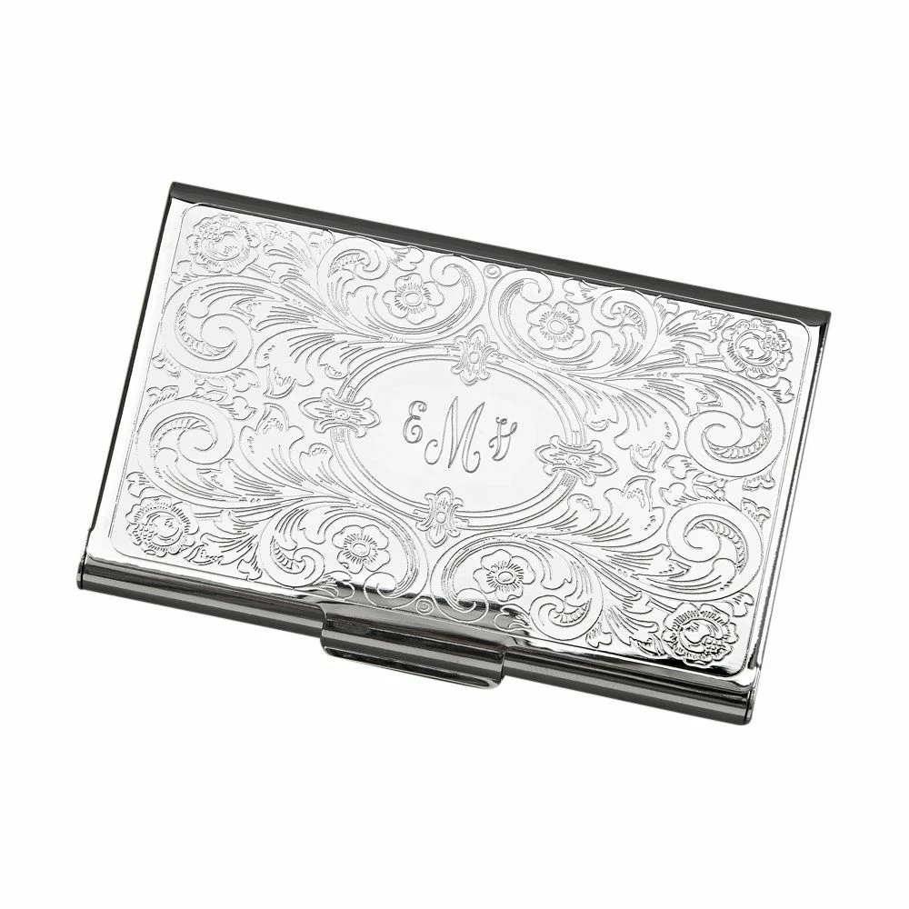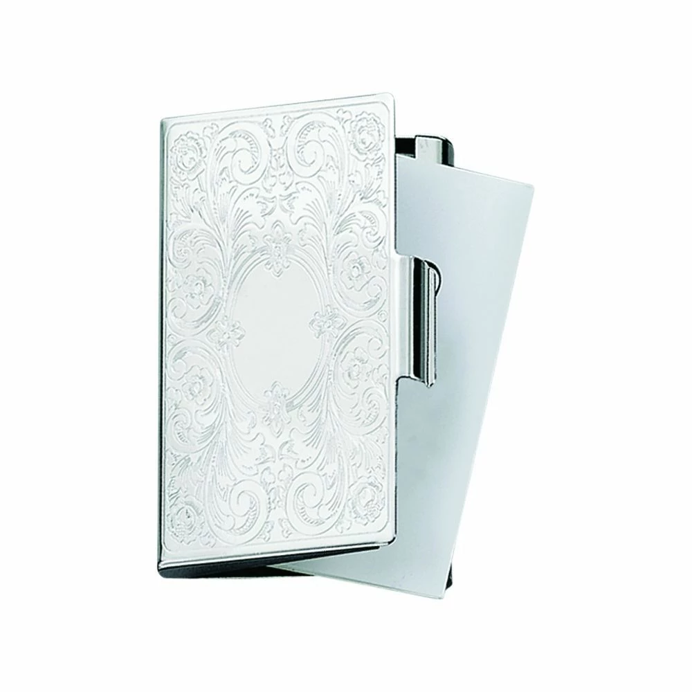 The case holds up to 21 standard business size cards. It has a bright, non-tarnishing, nickel plated finish. Gift box includes black velveteen pouch.