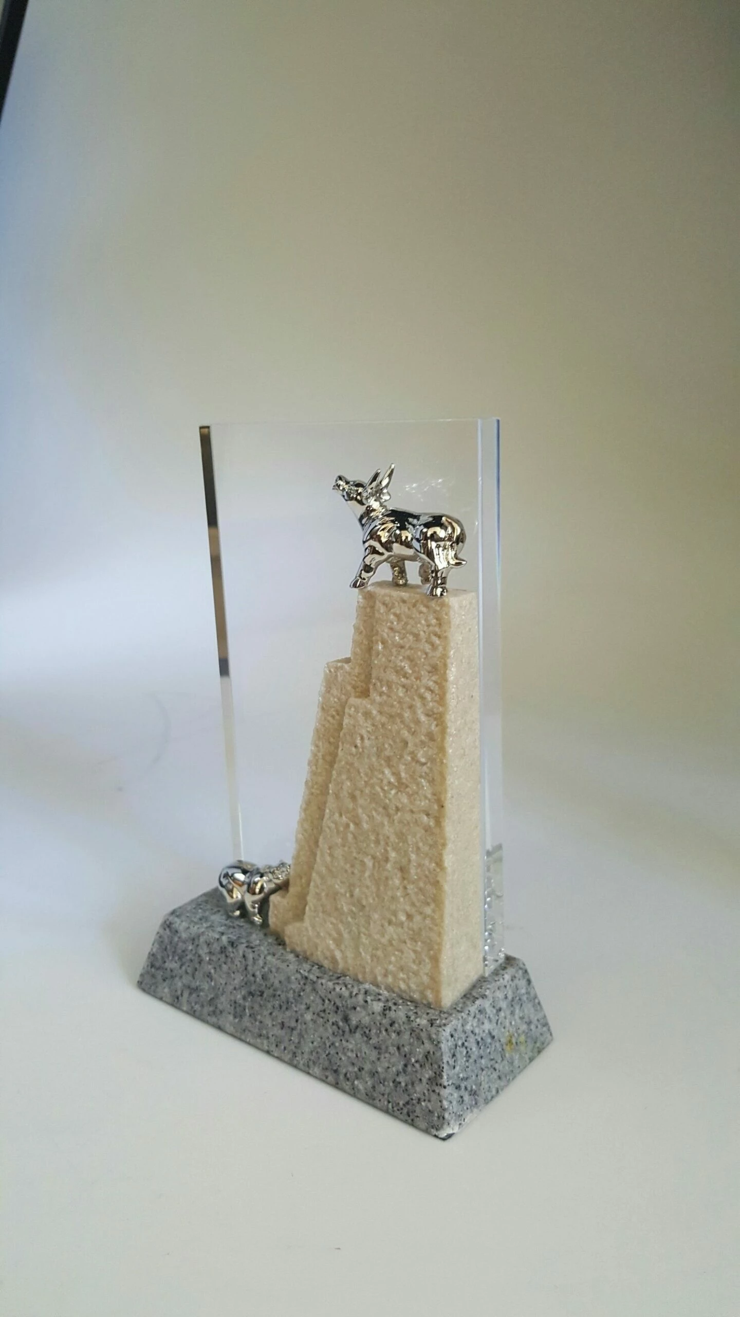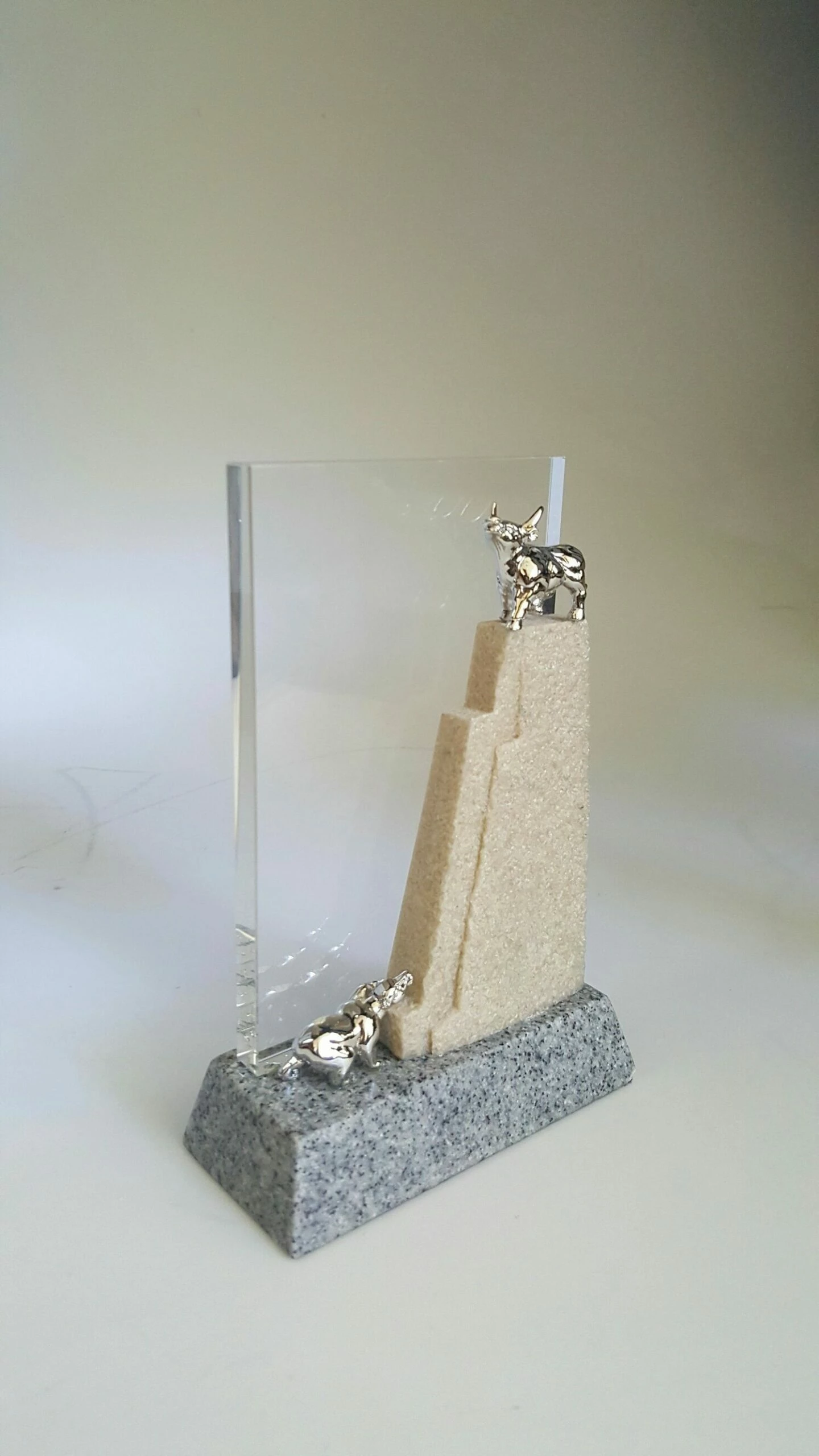 This item features a crystal wall on a high quality ceramic and granite base. The bull and bear are made of nickel so they won’t tarnish.