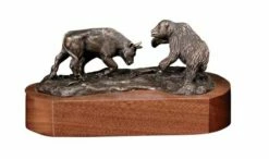 A solid bronze sculpture made in the USA. Bull and Bear are finely detailed, with the Bear’s dense fur and the Bull’s sleek hide sculpted. The Bull’s grassy territory is littered with the bones of prey he has devoured and he is ready to attack the charging Bear. Who knows which one will win this time?