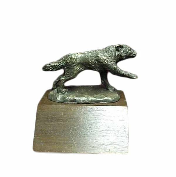 Looks like this wolf statue captures a wolf on the hunt. Moving forward with concentration. Made in the USA the craftsman has created a wolf in the middle of a day. Wolf is made of bronze and stands on a wood base. The base can be personalized with a plaque.