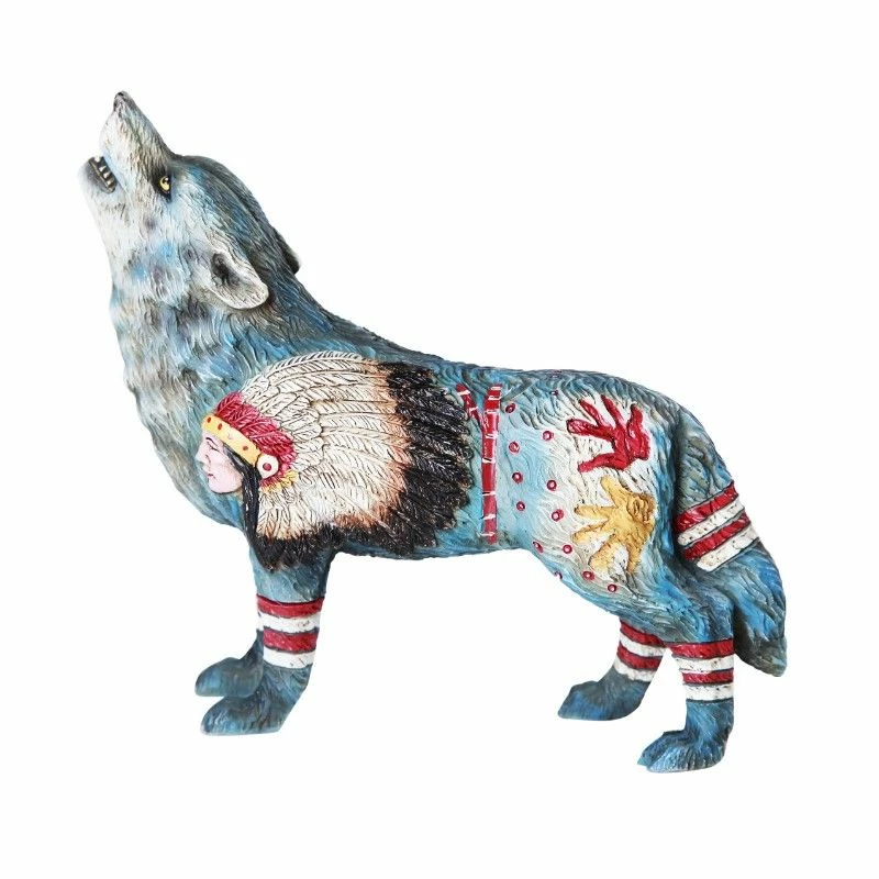 This statue illustrates the interesting connection between a wolf and the Native American people. One can assume the blue background of the wolf represents the sky. The Handprint is a common symbol used. It represent success in hand to hand combat.