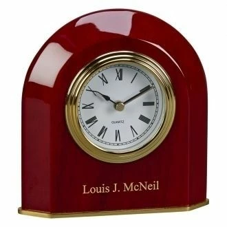 Our classic wood arch alarm clock has a rich, piano finish to go along with the gold accented face, base and backing.
