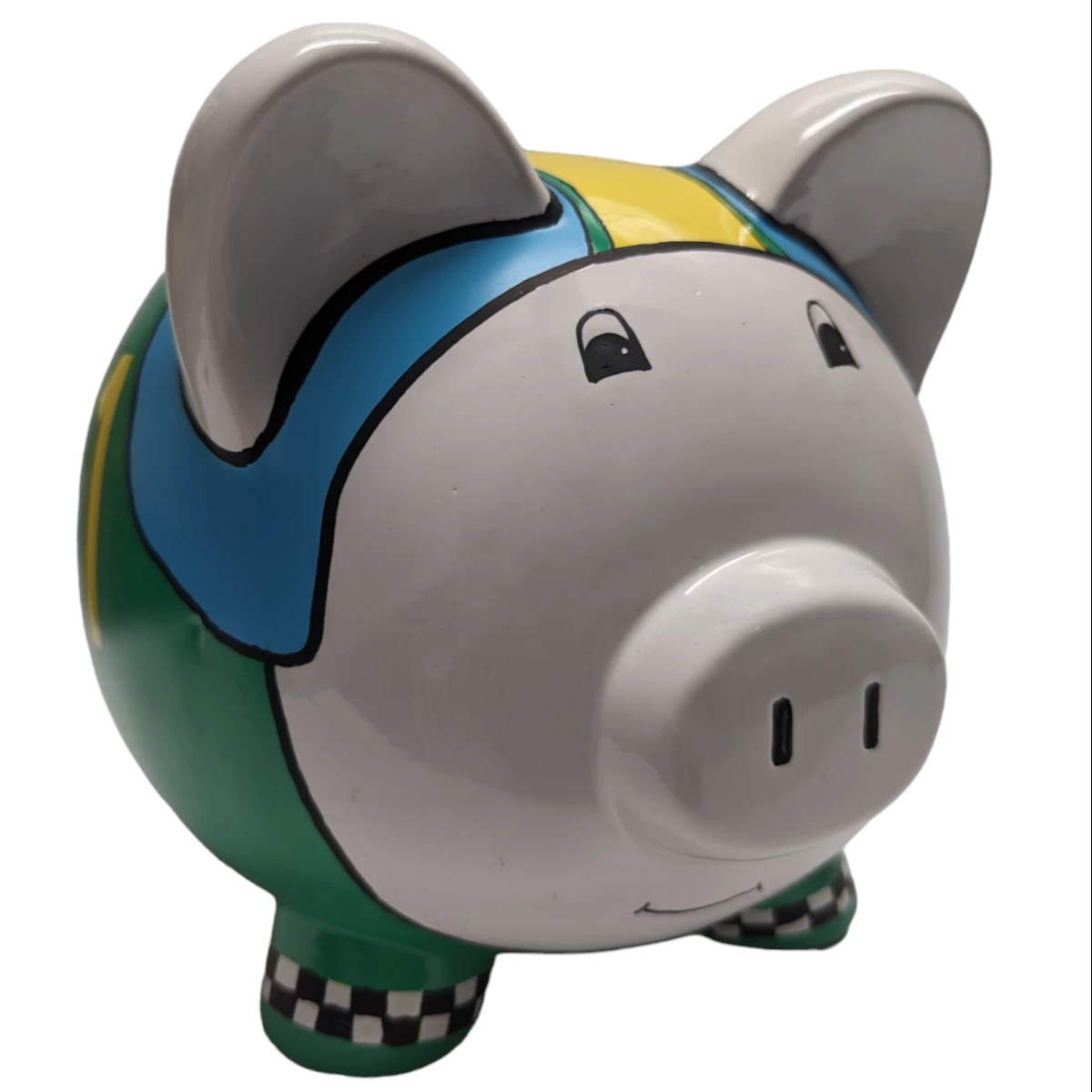Our artist, has captured the spirit of a racer on the pig with colorful attire. Could be any activity whether it’s a track event, a car event, or even heading off to college or a new career. We can specialize the pig even more if you have an idea you’d like to add.